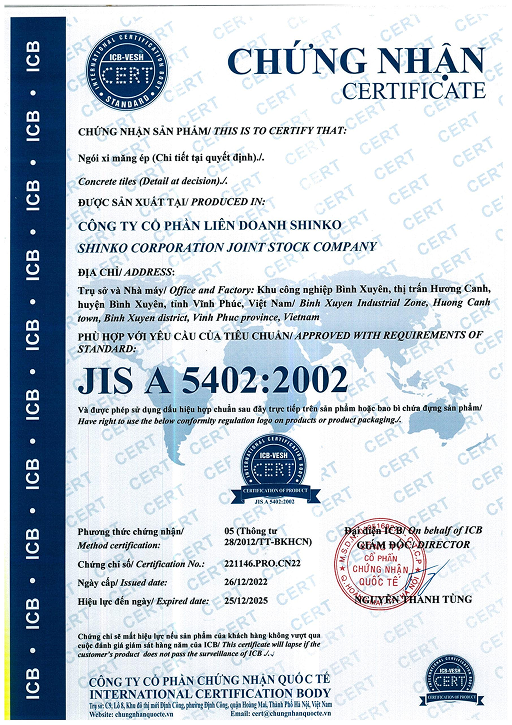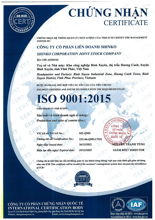SHINKO is the first Vietnamese business to operate an 8 tile-per-row production line that can ship up to 8 million tiles a year. SHINKO Color Tiles are ISO 9001:2015 compliant and Japanese Industrial Standard JIS A 5402:2002 compliant, environmentally friendly, and safe for users. The product has quickly established the reputation and position of SHINKO CORP in Vietnam’s construction material industry.